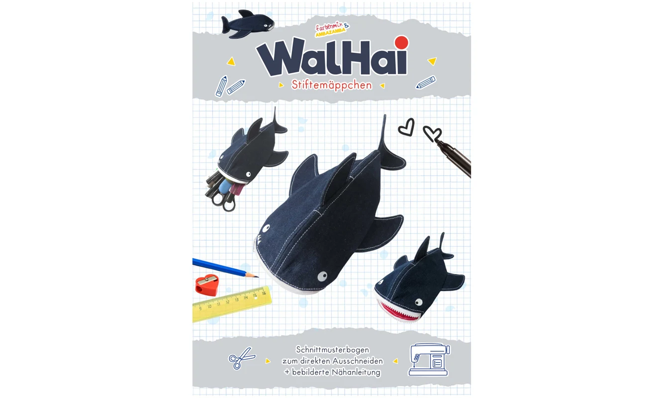 Cooles Stiftemäppchen/Schlamperle WalHai nähen als Papierschnittmuster (Booklet DINA4 mit herausnehmbarem Schnittbogen zum Ausschneiden)Der WalHai ist der größte Fisch der Welt! Er kann bis zu 20 Meter lang und 100 Jahre alt werden. Er ist sanftmütig und frisst nur Plankton. Charakteristisch für ihn ist sein breites Maul. Daher war er meine Inspiration für dieses Federmäppchen, welches einige Stifte, Kleber, Schere, Lineal und Radiergummi aufnehmen kann. Natürlich passt auch jede Menge anderer Kleinkram rein, es brauchen ja nicht alle ein Federmäppchen, aber alle wollen einen WalHai, stimmt’s?