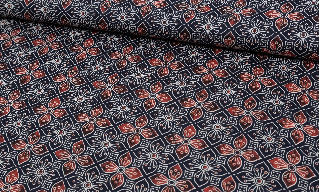 Dieser edle Voile Stoff aus 100% Baumwolle bringt mit seinem grossflächigen Blumenprint auf warmem Rotton sommerliche Eleganz und einen Hauch Boho-Romantik in jedes Nähprojekt. Die detailreichen floralen Elemente in Blau, Creme und Braun wirken wie handgemalt und erzählen von indischer Stofftradition mit modernem Twist.Der Baumwollvoile ist wunderbar leicht, weich und luftig, mit feinem Fall und angenehmem Griff. Ideal für Blusen, Kleider, Tuniken oder Schals, die leicht mitschwingen und feminine Leichtigkeit ausstrahlen. Durch die dezente Transparenz wirkt der Stoff elegant, ohne durchsichtig zu sein.