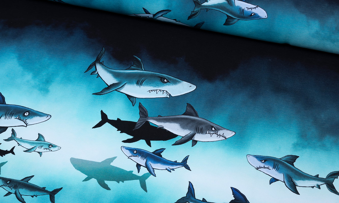Dieses Panel bringt pure Energie auf den Tisch. Dynamische Haie gleiten durch eine kraftvolle Unterwasserwelt und machen dein Nähprojekt zum echten Blickfang. Der Look wirkt modern, spannend und genau richtig für alle, die gerne mit starken Motiven arbeiten.French Terry überzeugt hier mit einem angenehmen Griff und einer schönen Balance aus Weichheit und Stabilität. So entstehen Teile, die nicht nur cool aussehen, sondern sich auch richtig gut tragen lassen. Das Panel eignet sich perfekt, um gezielt Highlights zu setzen und Designs bewusst in Szene zu setzen.