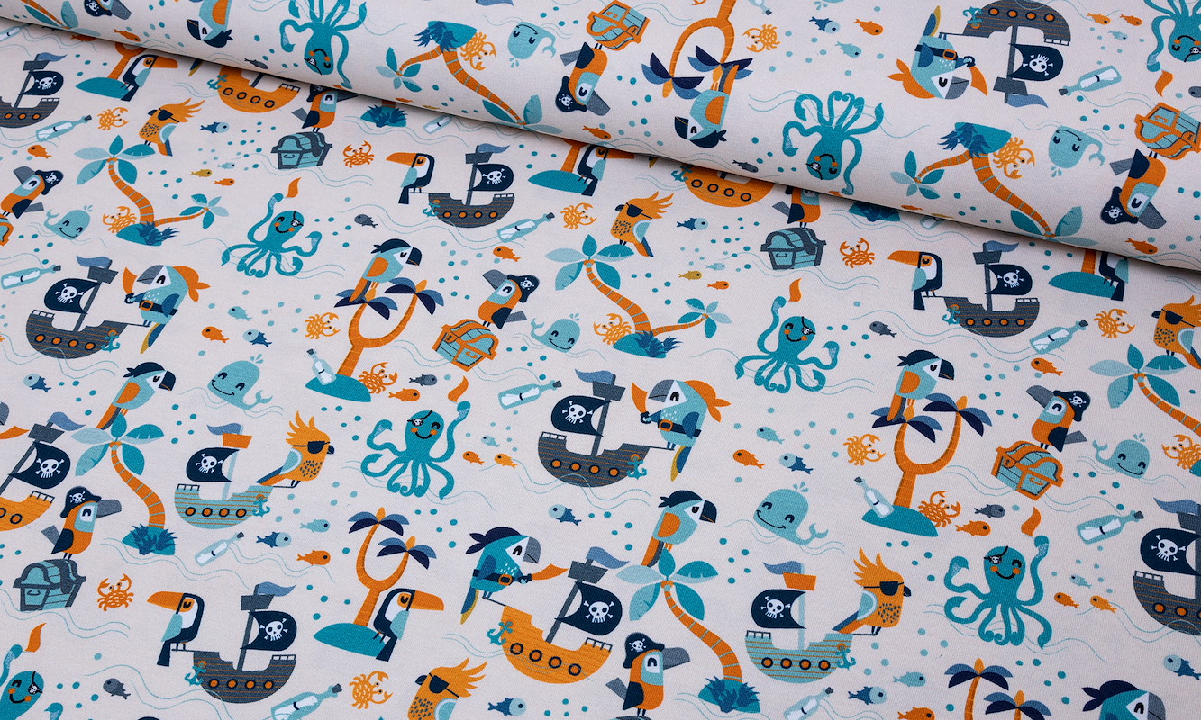 Mit diesem Jersey wird jedes Nähprojekt zum kleinen Abenteuer. Bunte Piraten, lustige Tiere, Schatzkisten und maritime Details bringen Bewegung, Freude und ganz viel Fantasie auf deinen Nähtisch. Das verspielte Design wirkt lebendig, modern und gleichzeitig wunderbar leicht, perfekt für kreative Ideen mit Spassfaktor.Die weiche, elastische Qualität sorgt für ein angenehmes Tragegefühl und macht den Stoff ideal für bequeme Lieblingsstücke. Die frischen Farben und die liebevollen Illustrationen schaffen eine fröhliche, einladende Optik, die sofort gute Laune verbreitet. Ein Stoff, der Kreativität weckt und jedes Projekt mit einer spielerischen Leichtigkeit füllt.