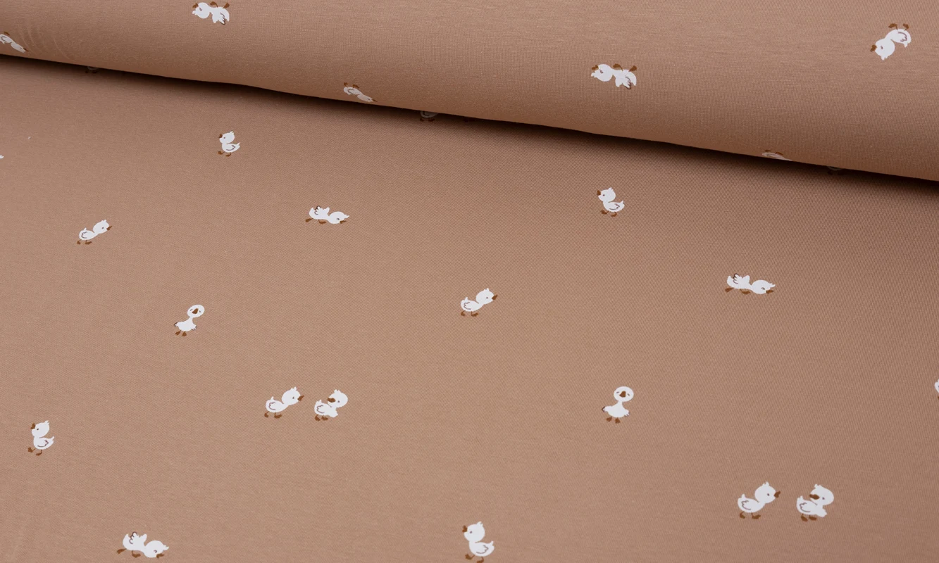 Dieser liebevoll gestaltete Jersey Stoff mit kleinen Entchen verleiht jedem Nähprojekt eine fröhliche Note. Das weiche Baumwoll-Elastan-Gemisch liegt angenehm auf der Haut, ist wunderbar dehnbar und sorgt für maximalen Tragekomfort. Der warme, sanfte Farbton mit den weissen Entchen wirkt charmant, modern und lässt sich vielseitig kombinieren.Ob für Pyjamas, Shirts, Babybodys oder niedliche Kinderkleidung – dieser Jersey Stoff ist wie gemacht für kleine Lieblingsstücke und gemütliche Momente. Mit einer Breite von 145 cm, Öko-Tex Standard 100 Zertifizierung und weicher Oberfläche überzeugt er durch Qualität und Langlebigkeit.