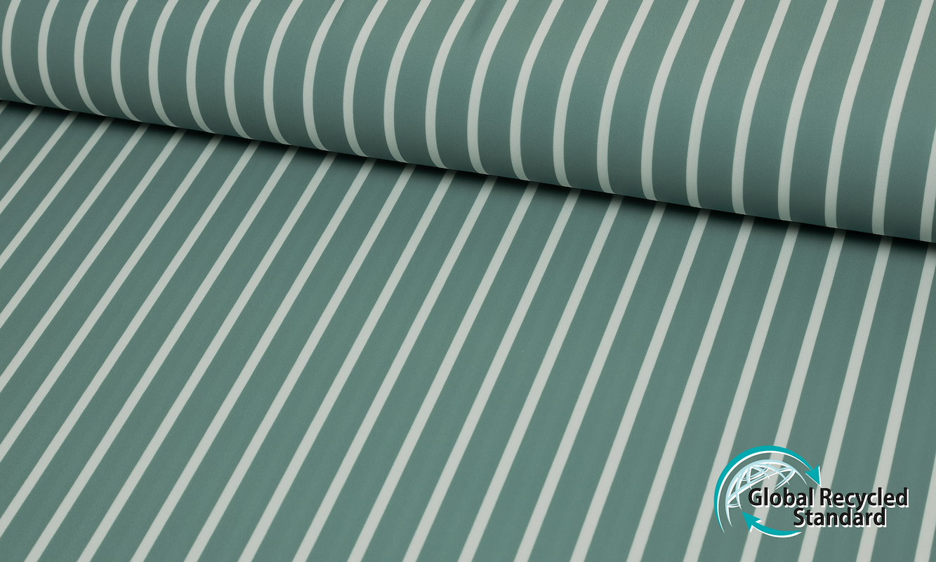 Maritime Streifen, recyceltes Polyester und schnelle Trocknung: dieser Badestoff in Dunsttürkis ist perfekt für Badeshorts und leichte Sportswear.