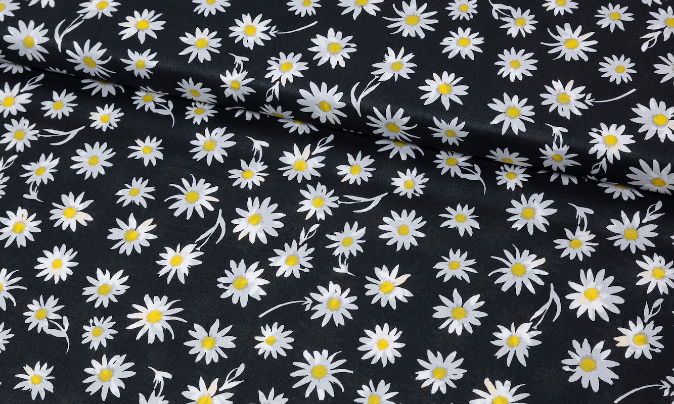 Die Kombination aus dunklem Untergrund und hellen Blüten macht diesen Stoff besonders vielseitig. Er lässt sich sowohl elegant als auch casual interpretieren und passt sich deinem Stil mühelos an.