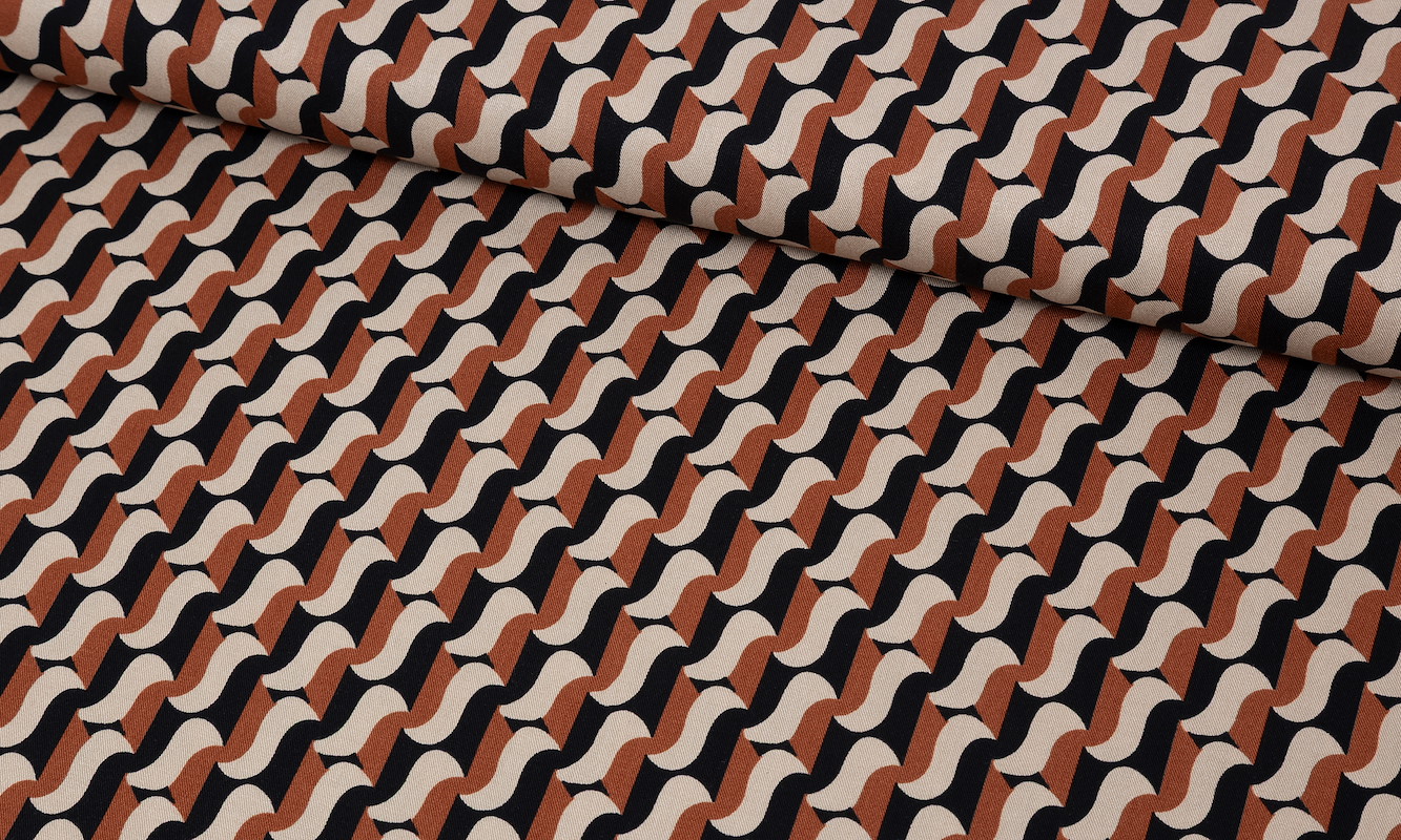 Dieser Viskose Twill bringt Bewegung in deine Nähideen. Die dynamischen Wellenlinien erzeugen einen spannenden Rhythmus und verleihen dem Stoff eine starke, grafische Ausstrahlung. Der Retro inspirierte Look wirkt modern, mutig und gleichzeitig stilvoll, perfekt für Designs, die auffallen und im Gedächtnis bleiben.Durch den fliessenden Fall und den angenehm weichen Griff entstehen Kleidungsstücke mit Charakter und Leichtigkeit. Das Muster sorgt für eine lebendige Optik, ohne überladen zu wirken, und lässt sich sowohl als Highlight als auch als stilvoller Allover Look einsetzen. Ein Stoff, der Modebewusstsein und Kreativität perfekt verbindet.
